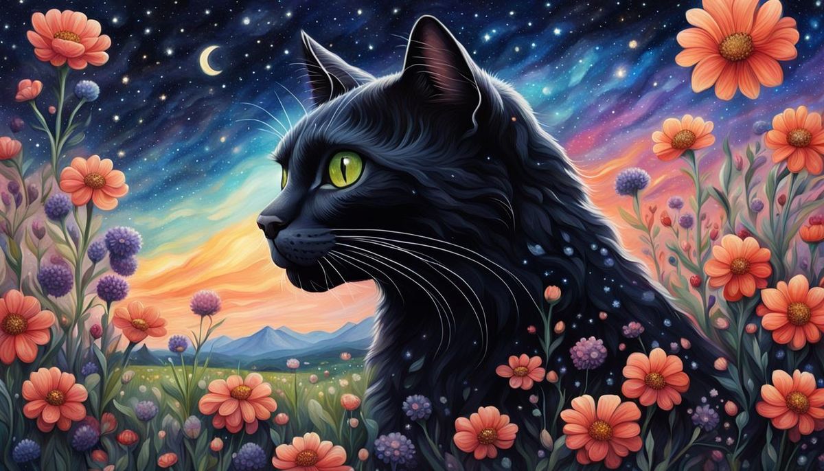 A striking picture of a black fantasy cat in a flower field at sunset. The image has dramatic, ornate details and is reminiscent of a highly detailed oil painting with watercolor elements.