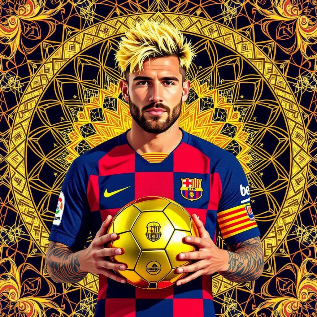 A digital rendering of a Barcelona soccer player with yellow hair and tanned skin, holding a golden soccer ball. The background features abstract fractal patterns and 3D shading, in a futuristic style.