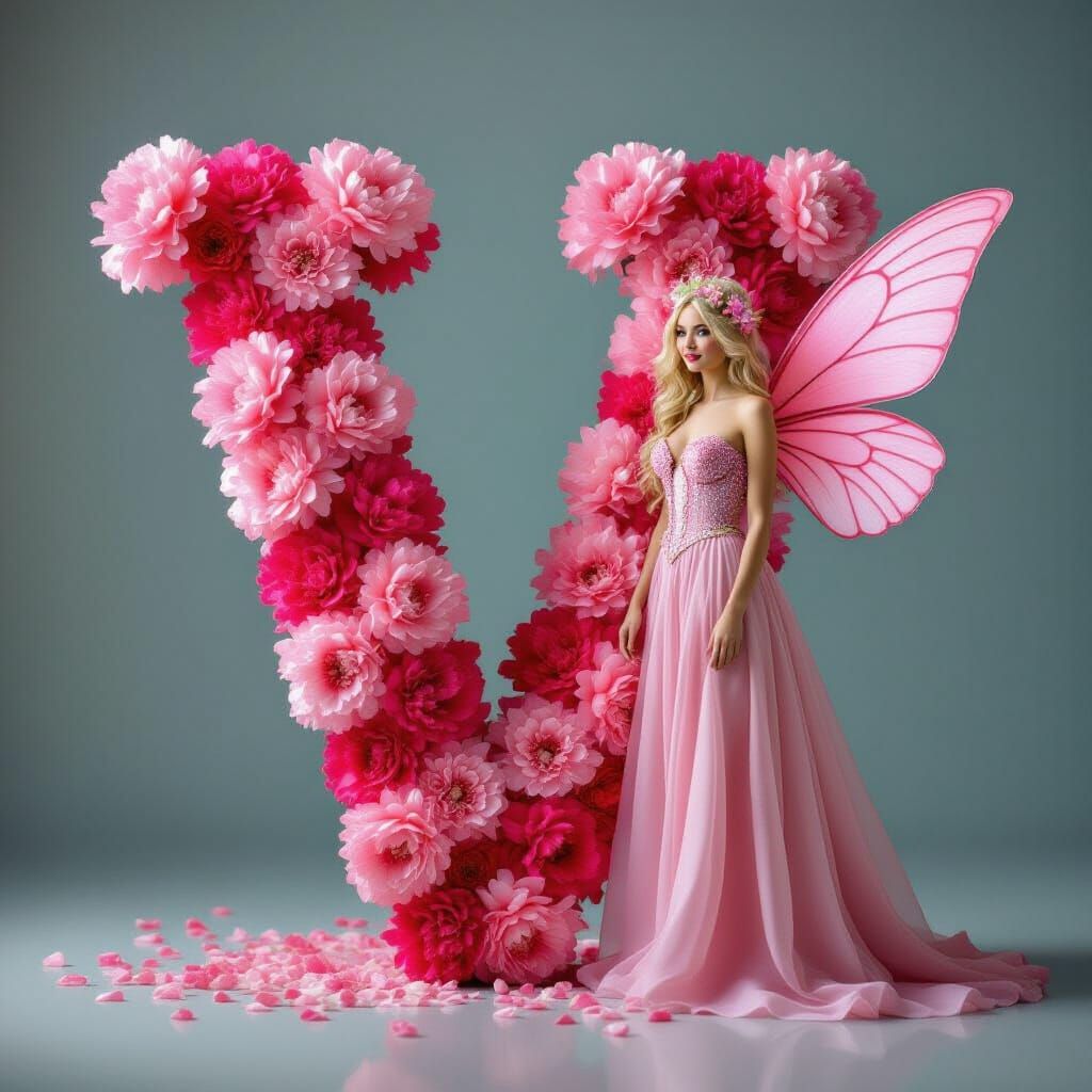 This image shows a delicate pink fairy standing next to the letter 'V' constructed entirely from pink carnation flowers. The scene is whimsical and floral.