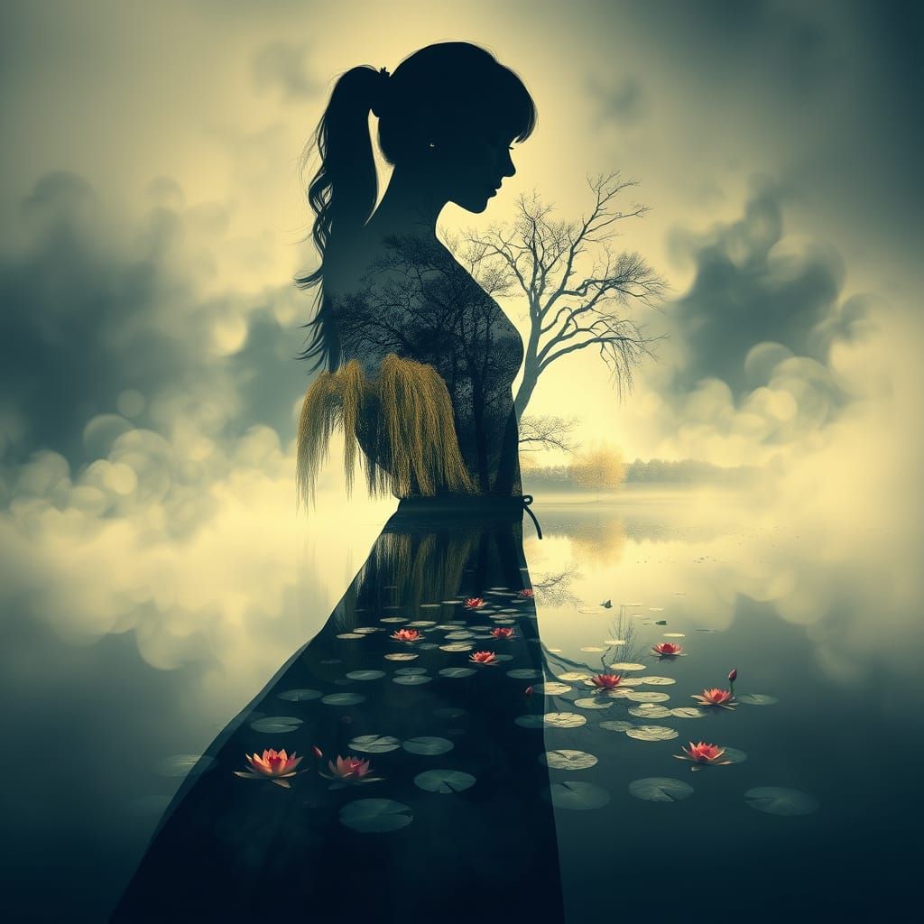 This image shows a double exposure of a woman's silhouette filled with a landscape of weeping willows and water lilies. The artwork evokes vintage Japanese ink painting with soft, ethereal lighting.
