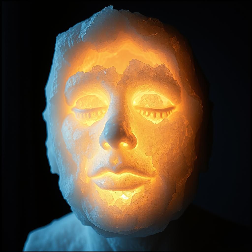 A cinematic still of a filigree face semisculpture crafted from salt crystals, illuminated from within. The image showcases dramatic, atmospheric lighting.