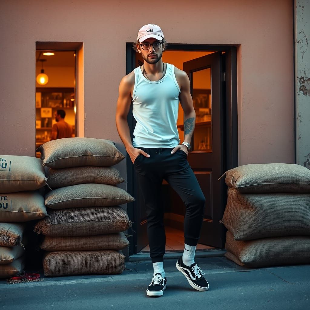 This image shows a slender young man leaning against jute sacks outside a cafe at dawn. He is wearing athletic attire and a pink baseball cap, with a silver chain around his neck.