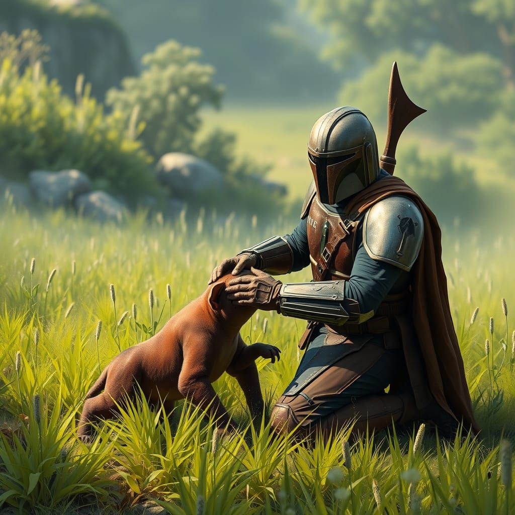 This image shows a Mandalorian warrior kneeling in a field, softly petting a baby rancor. The scene evokes nostalgic futurism with expressive character designs and industrial realism.
