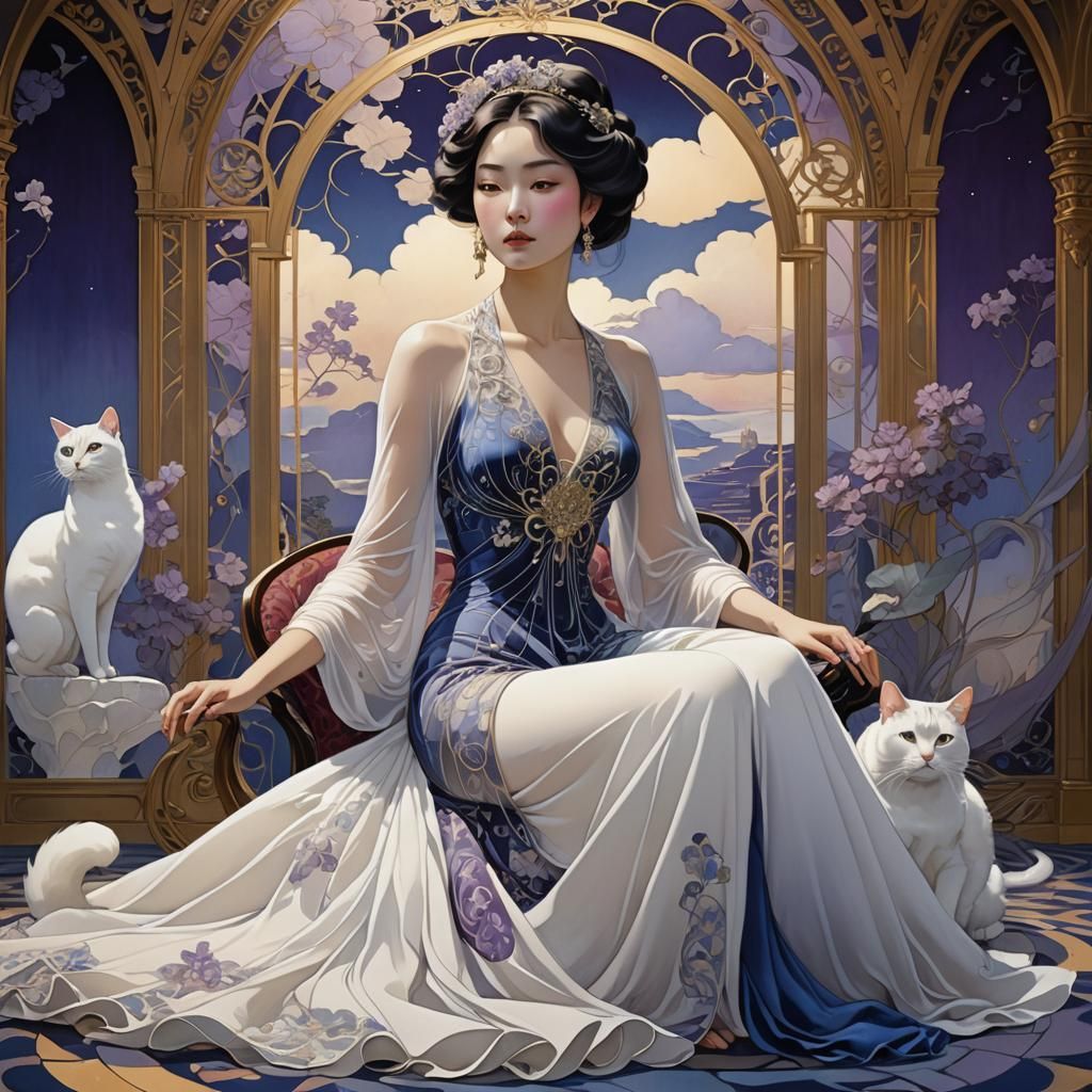 A captivating image of a woman and a cat in an ornate room. This image showcases flowing fabrics, curvy lines, and a palette of blues, purples and gold with soft lighting. Art Nouveau style.