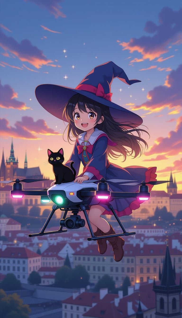 This image shows a cheerful young witch soaring over Prague Castle on a drone at sunset. A black kitten sits on her shoulder in this matte painting with deep colors inspired by anime.