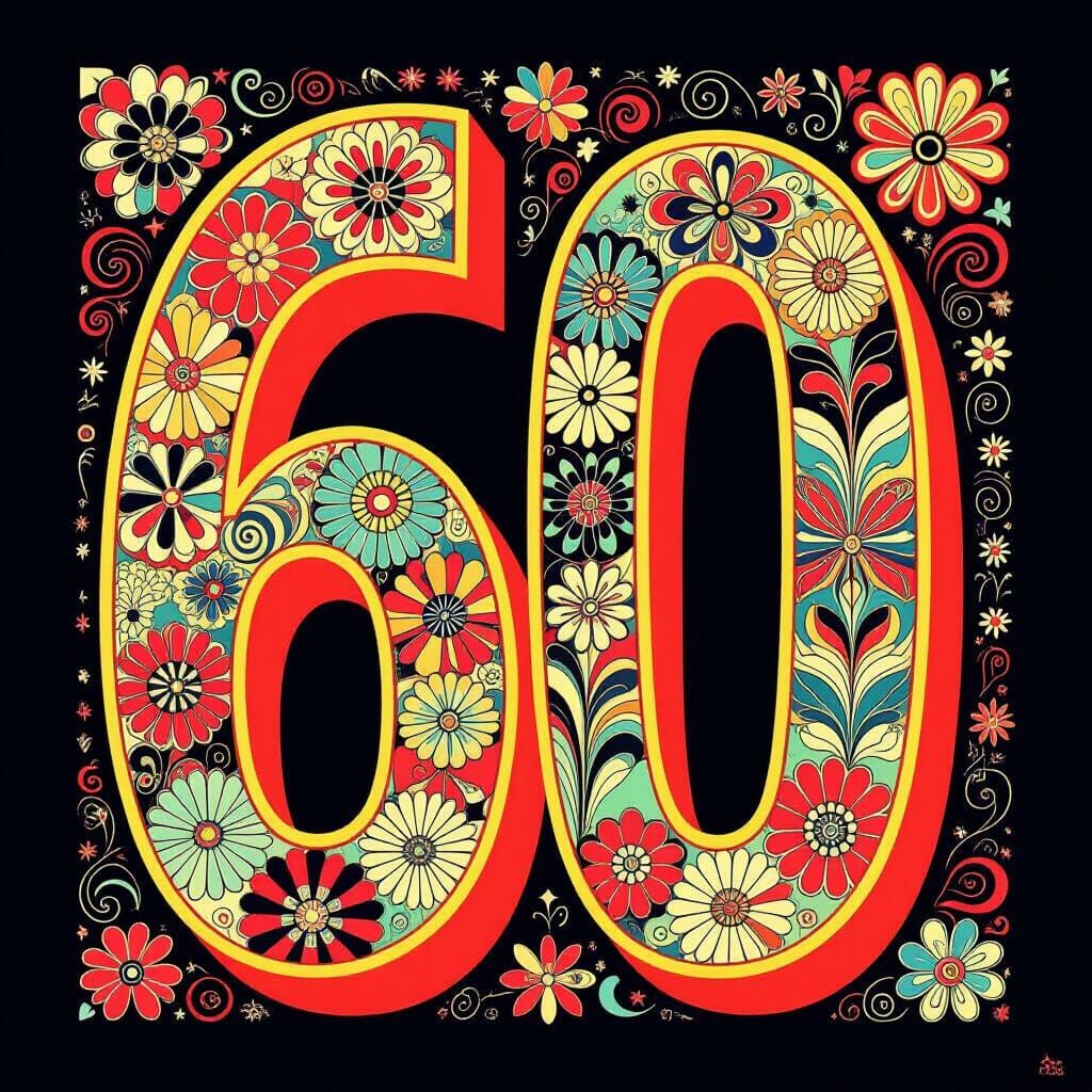 A vivid image showcasing the number 60, rendered in a surreal pop art style. The artwork features bold lines, bright colors, and a blend of digital and hand-drawn elements.