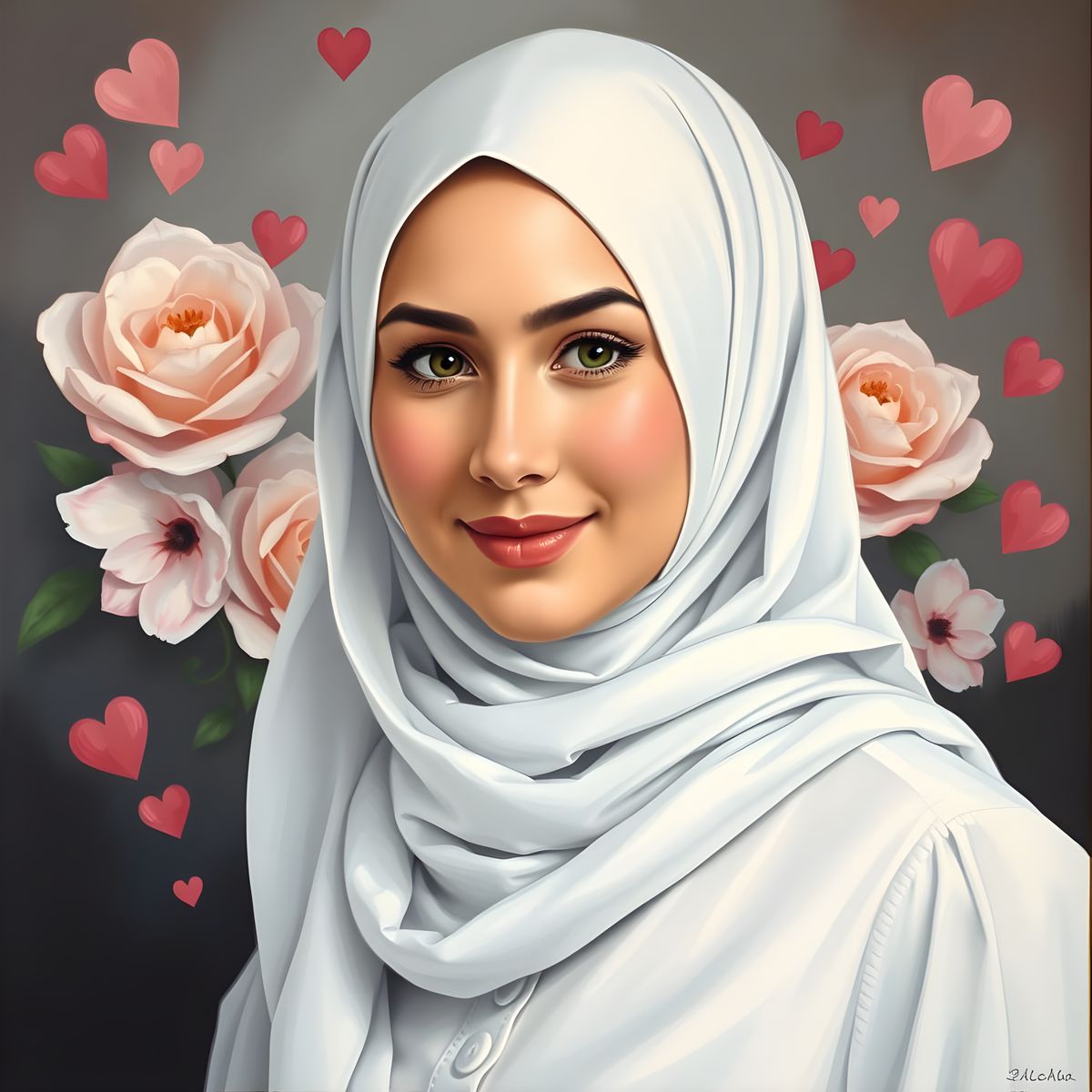 This image shows a beautiful, modern oil painting of a smiling Caucasian woman wearing a white hijab. The portrait is set against a background of flowers and hearts.