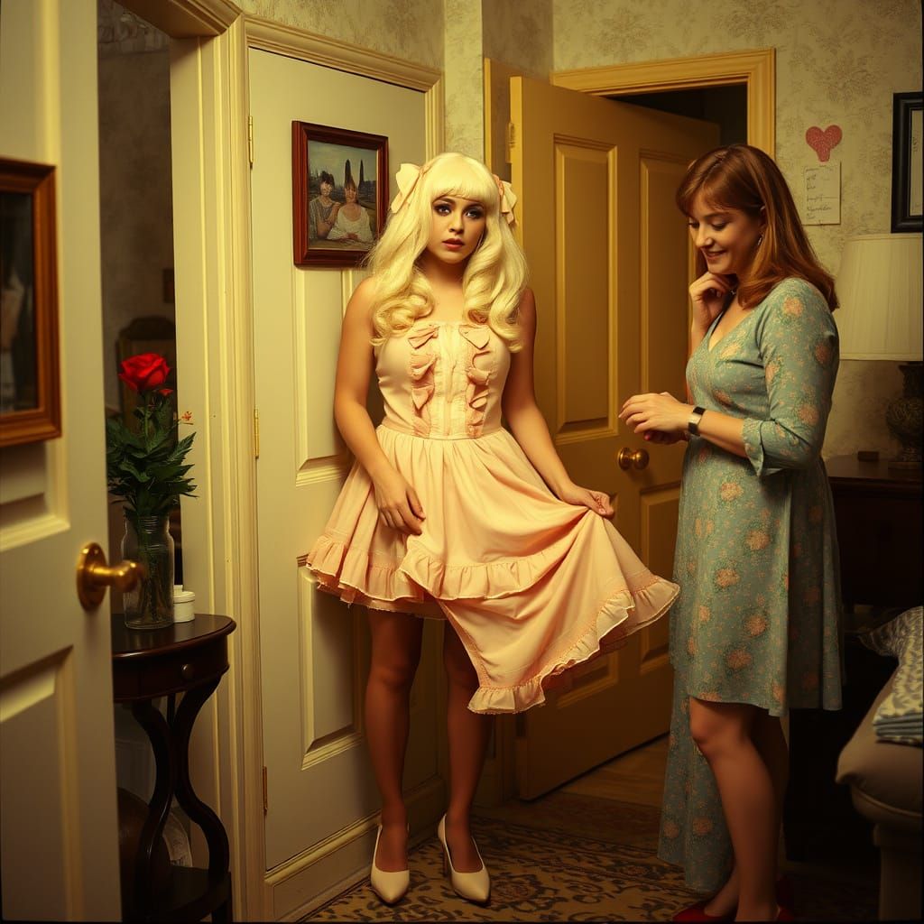 A cinematic film still capturing an embarrassed young man in a frilly brolita dress, makeup, and blonde wig. His mother and girlfriend check his attire.