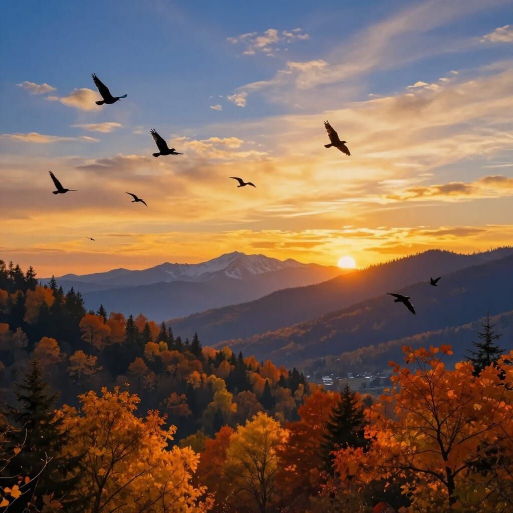 This image depicts a serene, painterly mountain scene bathed in golden light on a celebratory Thanksgiving day. Numerous birds fly peacefully against a vibrant sky, rendered with dramatic lighting and a rich color palette.