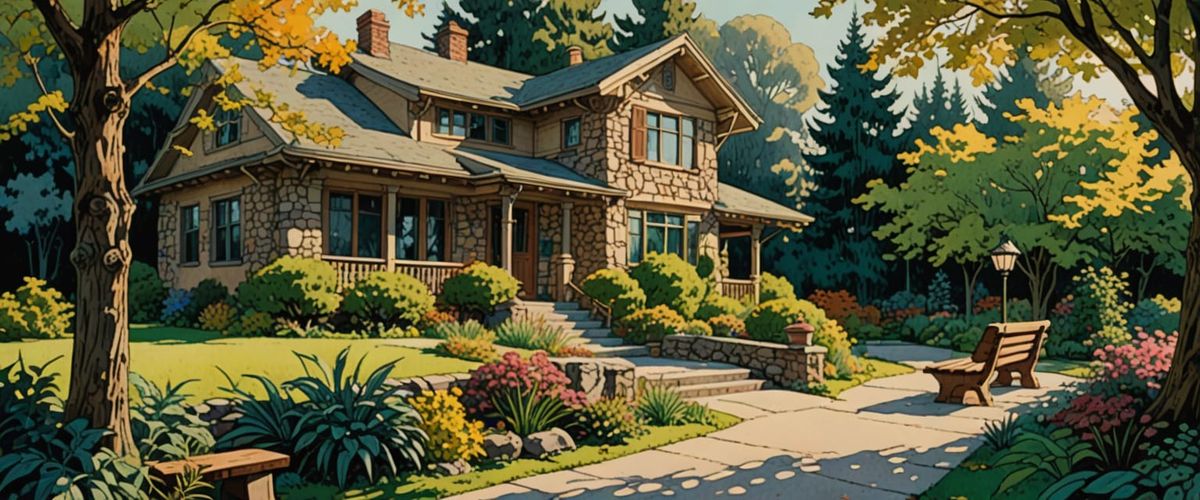 This image shows a stone mid-century modern home with a quaint, naive aesthetic. The scene is bathed in late afternoon sunlight, with comic book style rendering, and watercolor and gouache techniques.