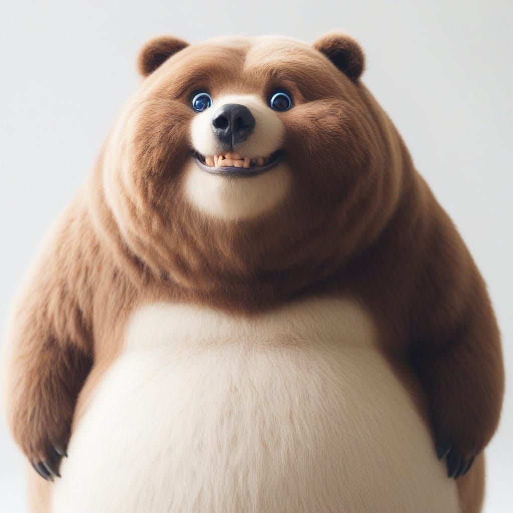 A close-up portrait of a chubby Kodiak bear with a sweet, toothy grin and big, blue, shy eyes, set against a minimalist light background.