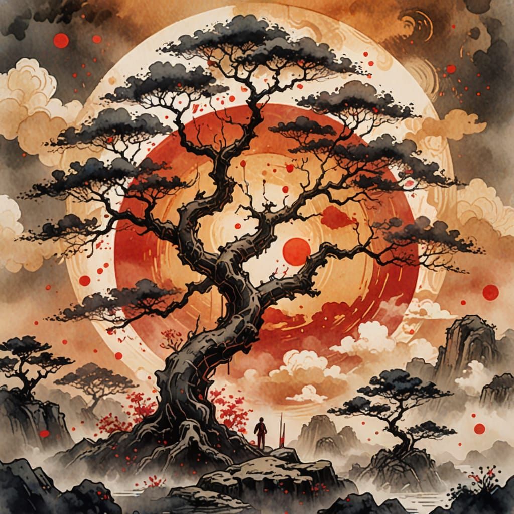 This image shows an old tree and a human figure beneath a red sun on Venus. It's rendered in a Chinese ink painting style, with soft watercolor clouds and vector accents, featuring warm golden lighting.