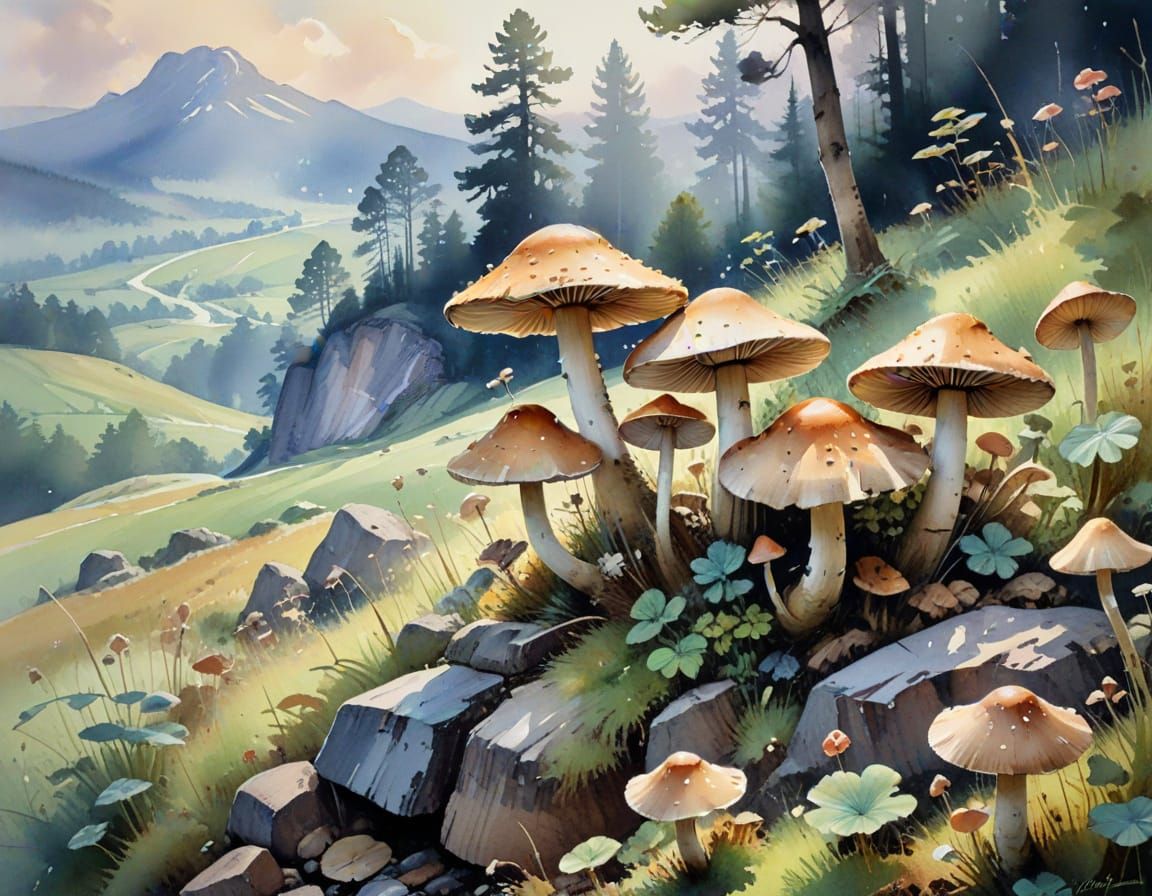 This image shows a serene hill landscape with a close-up of realistic mushrooms growing between the rocks, painted in a soft, ethereal watercolor style reminiscent of traditional botanical art.