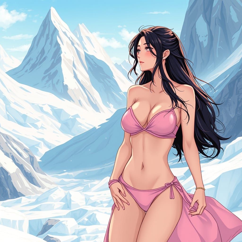 This image shows a young woman in a flowing bikini standing on a glacier surrounded by icy peaks. The image is in a vibrant manga and anime style, with digital painting and hand-drawn elements.