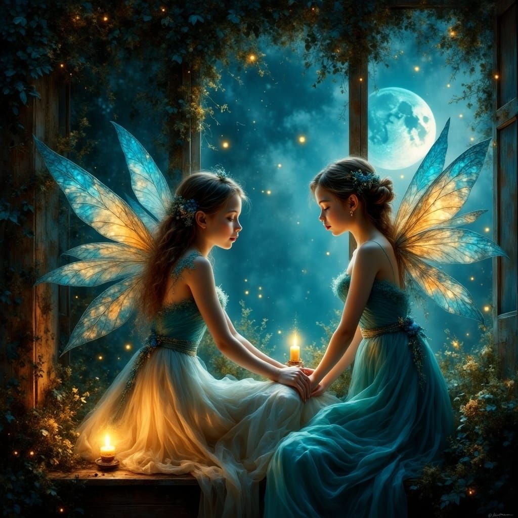 A captivating image of two fairies with translucent wings observing a sleeping baby through a window. Soft moonlight illuminates the scene, creating a cinematic, fantasy aesthetic with hyperrealistic details.