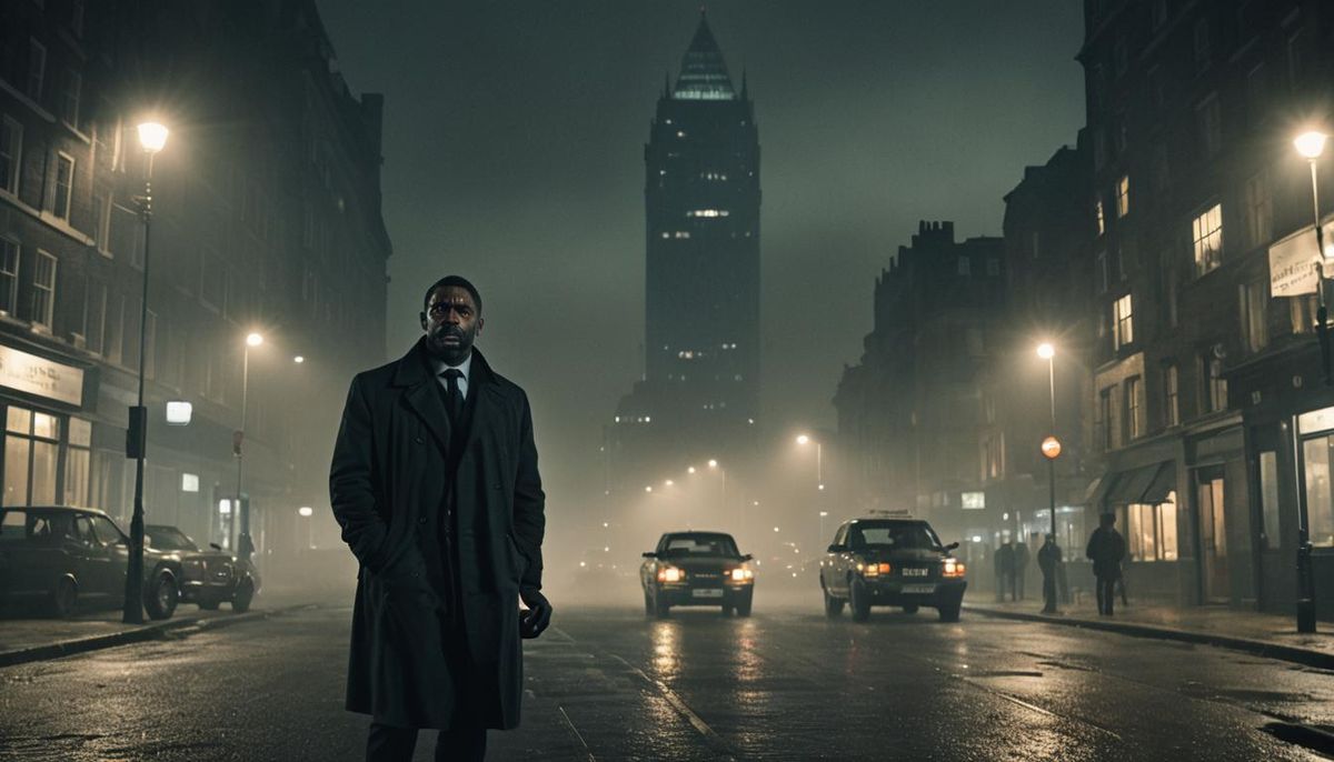A medium shot of a troubled detective standing on a dimly lit London street at night. The atmospheric image showcases a glowing cityscape, subtle lens flares, and a warm color grading, reminiscent of a vintage analog film.