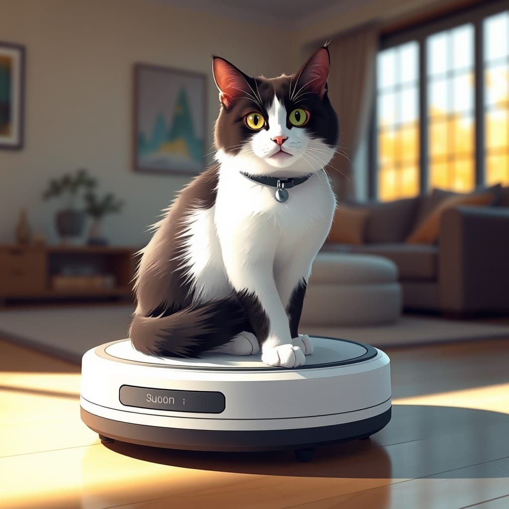A black and white cat with green eyes sits regally on a robot vacuum in a sunlit room. The image is reminiscent of detailed wildlife illustrations with futuristic and whimsical character design elements.