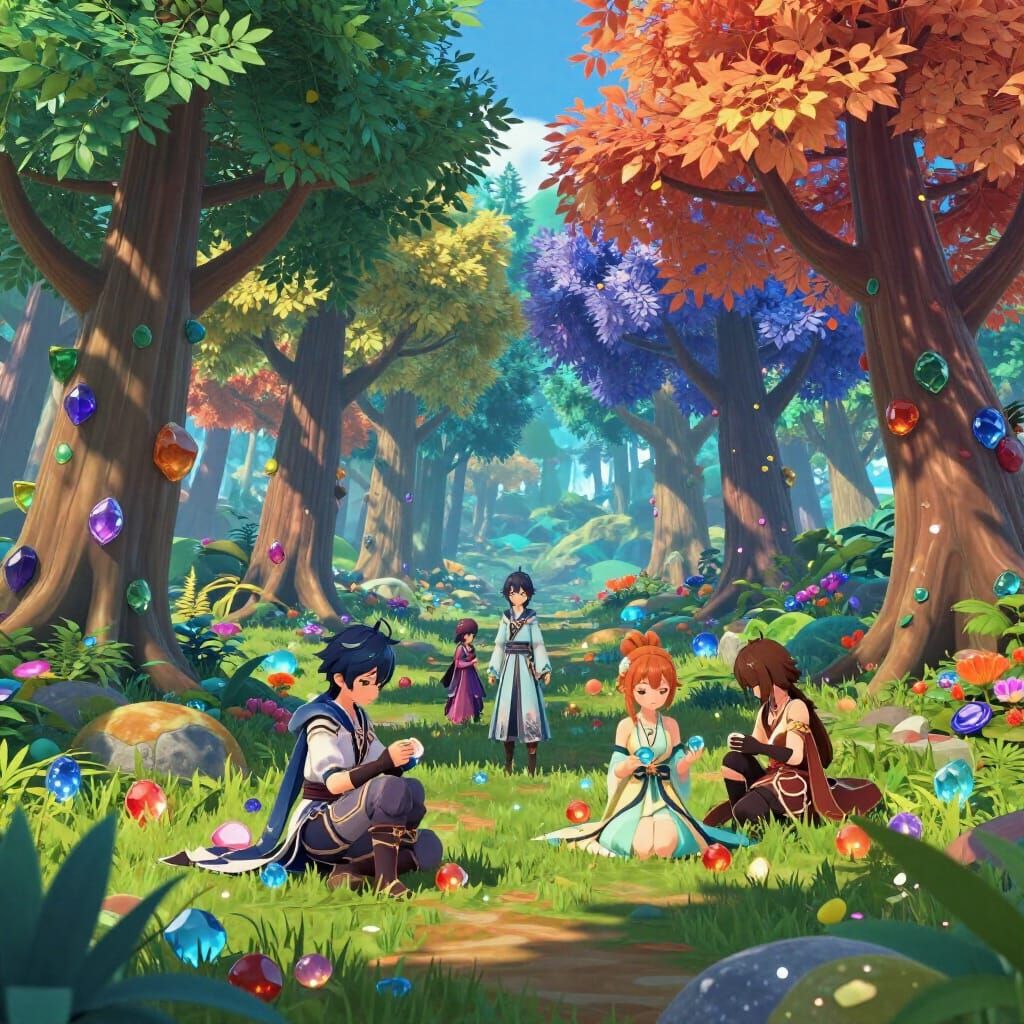 This image depicts a luminous fantasy forest where trees grow precious gemstones. Figures in anime robes gather the vibrant gems in a detailed, concept art rendering with dynamic lighting.