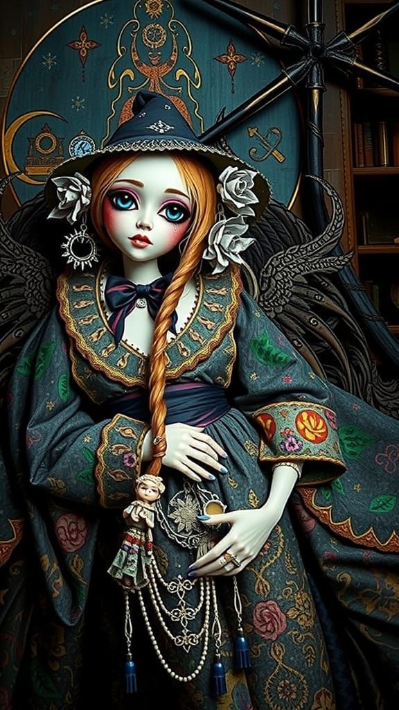 This image shows a peaceful witch with a sun doll, blending Jugendstil and Gothic elements with vibrant, psychedelic influences. It evokes an idyllic and healing atmosphere.
