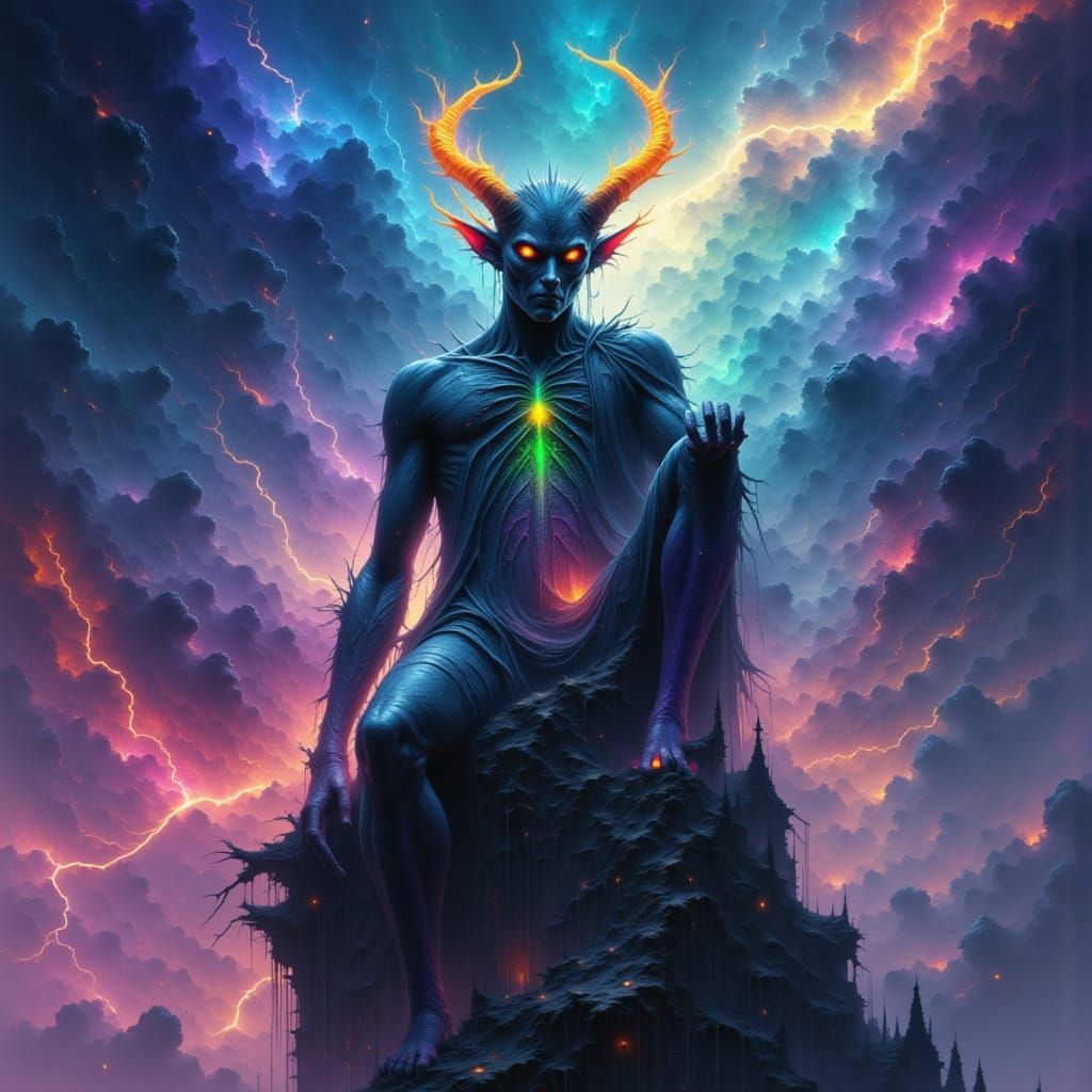 This image shows a celestial alien demon with glowing eyes and horns on a gothic cathedral spire under a nebula. Rendered with dramatic shadows and ethereal lighting, featuring bioluminescent markings.