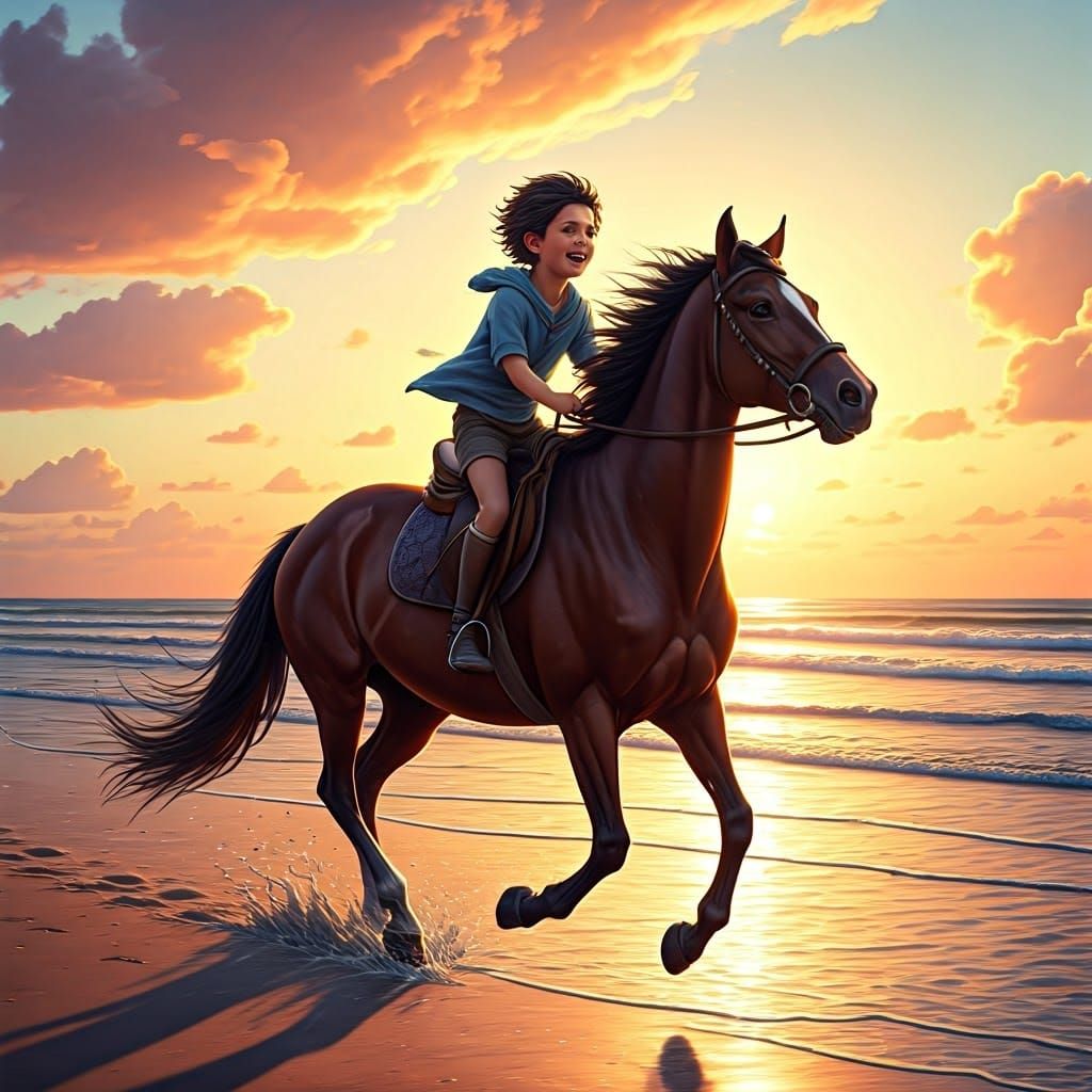 A bright image of a young boy riding a dark brown horse along a beach at sunset. Golden light fills the scene, captured in 8k resolution with intricate textures and details.