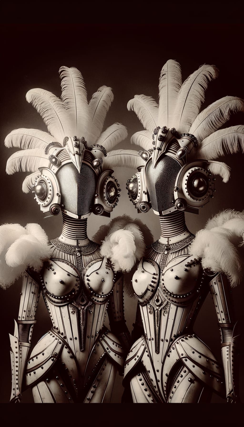 This image shows two angular metal figures in lavish 1920s showgirl costumes, rendered in a soft-focus, sepia-toned photographic style with a surreal, steampunk twist.