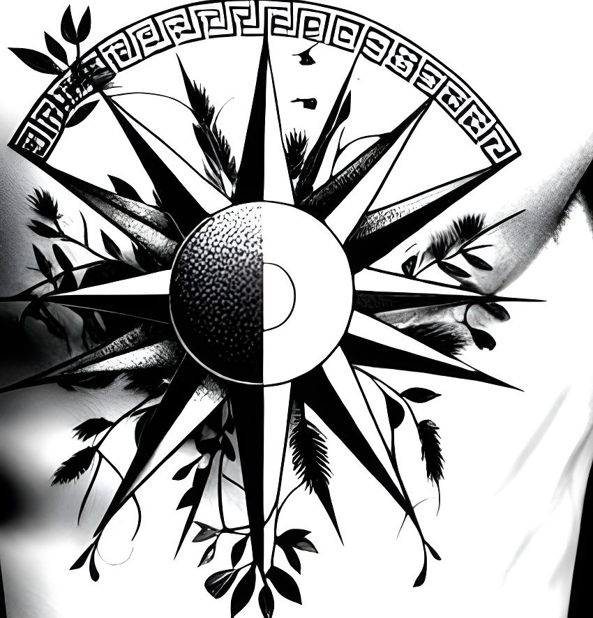This image showcases an elegant fox in a tuxedo at a party, alongside tattoo designs for a man's neck. The tattoos blend realism, geometric minimalism, and rustic Hellenic styles.