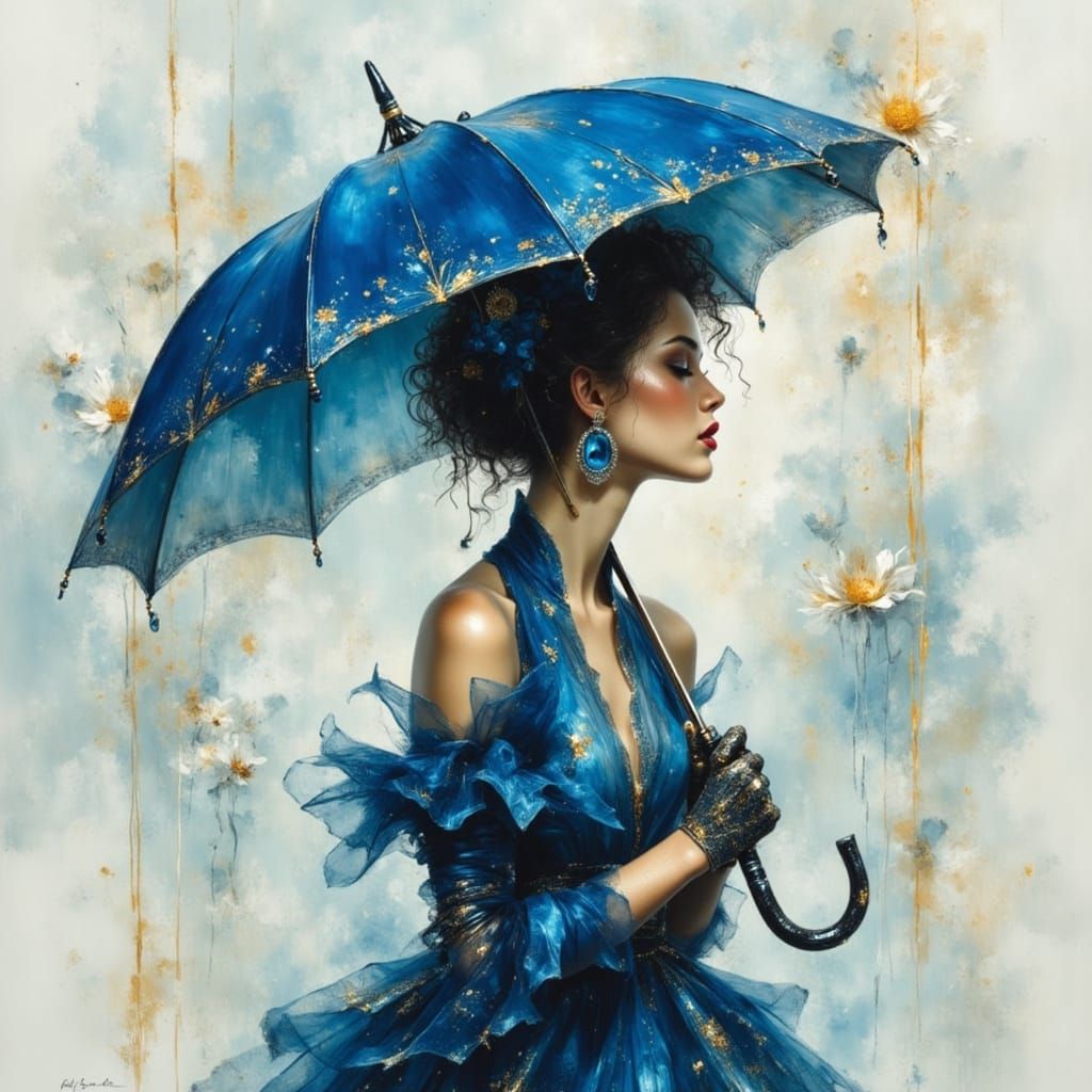 A painting of a woman holding a blue umbrella. The artwork employs a harsh palette knife style and a color palette featuring light cyan, gray, dark blues, and gold.