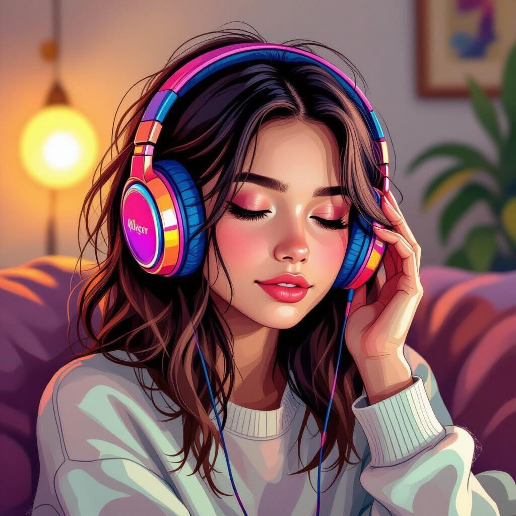 A young woman with bright headphones enjoys music in a warm, inviting setting. The image blends digital painting with textured, sketchy elements in a futuristic style.