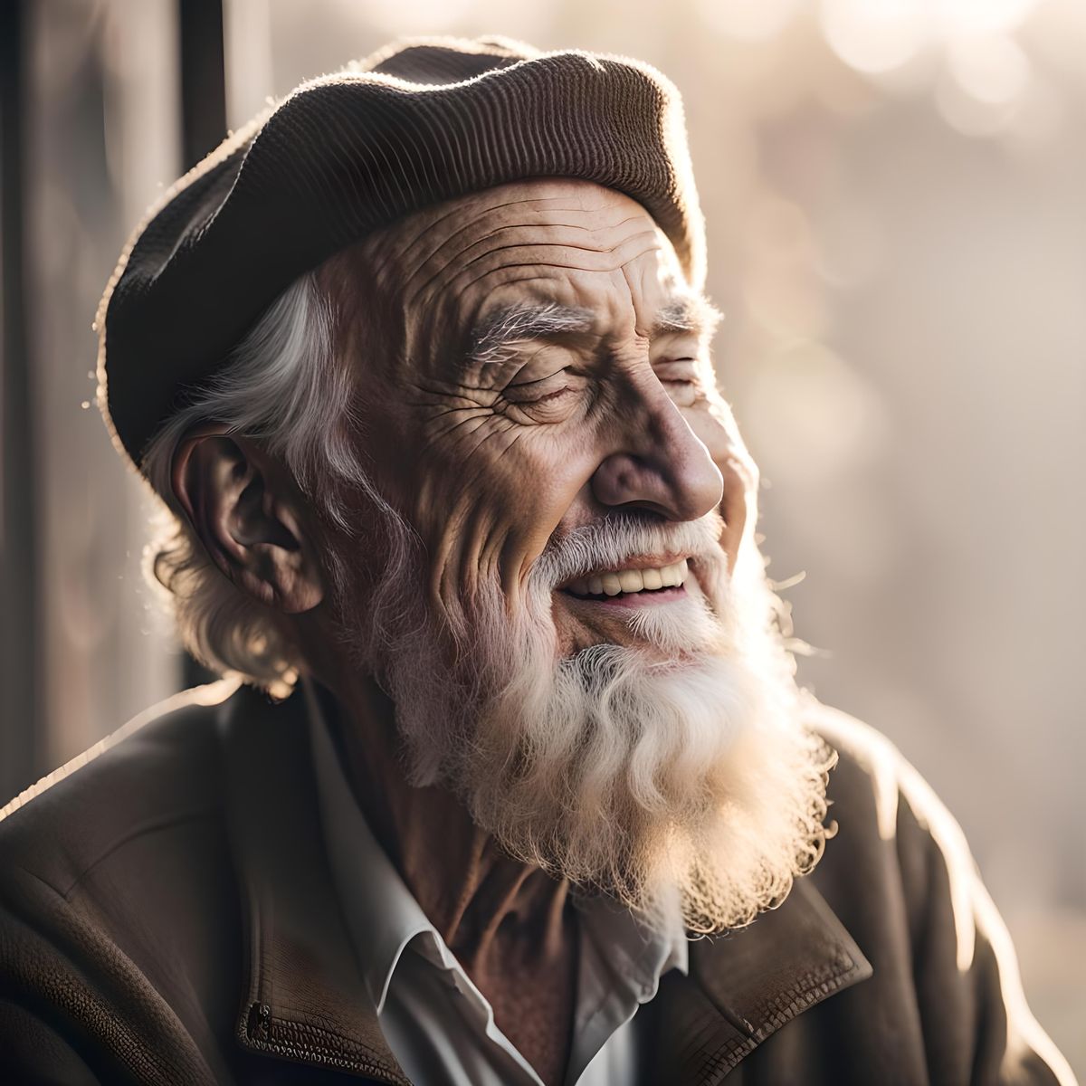 A poignant image of an elderly man with a beard, eyes half-closed, and a gentle smile, lost in reflection. Golden hour lighting enhances the warmth and depth of emotion.
