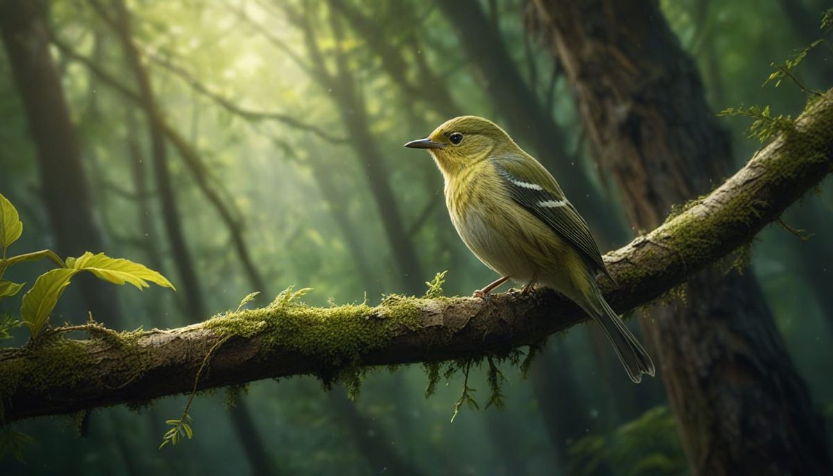 This hyperrealistic concept art depicts a wood warbler with vibrant plumage perched on a branch, set against a colorful forest. Dramatic side lighting enhances the intricate feather detail.