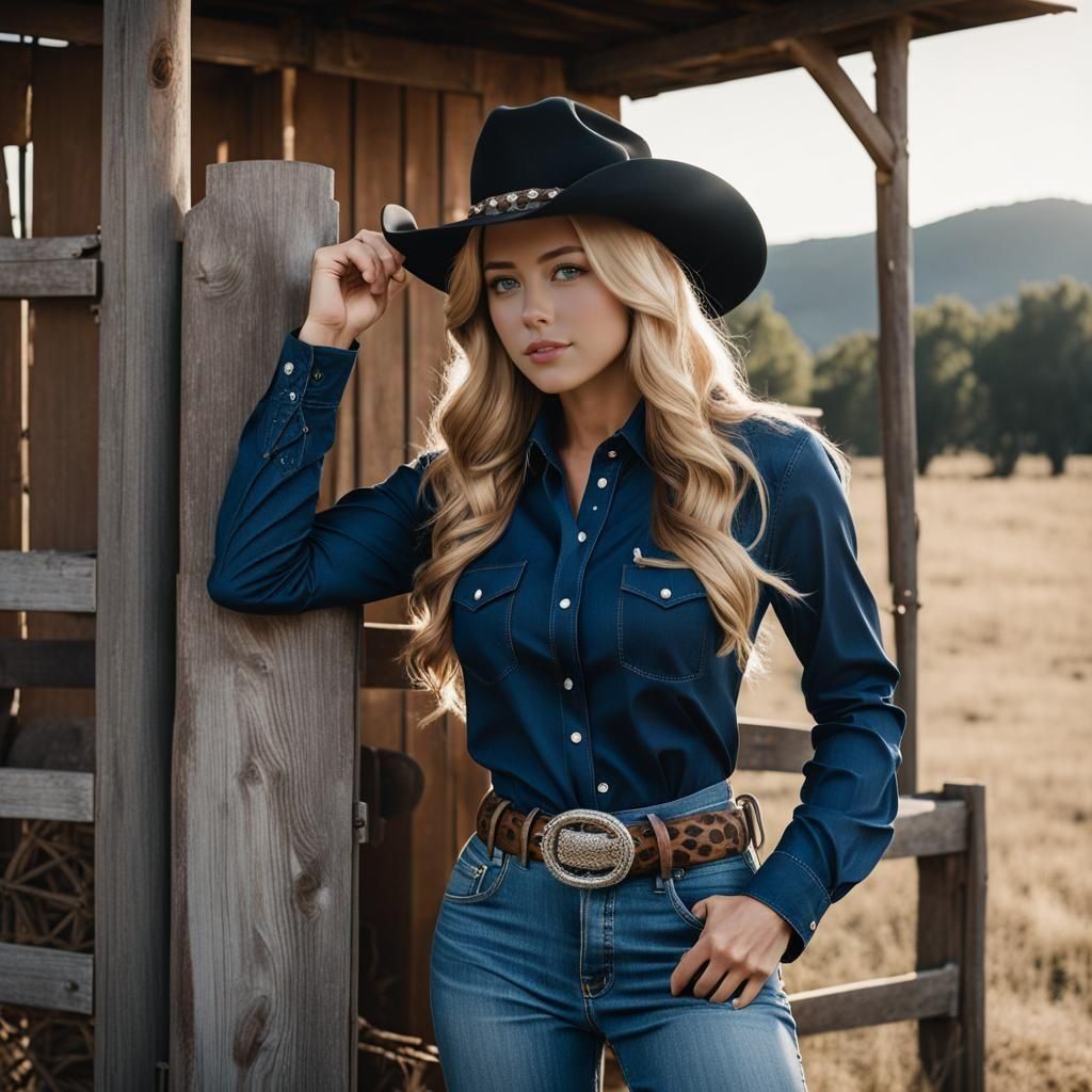 "The Western Aesthetic is best represented by the image of a stunning young cowgirl with long wavy milk coffee blonde hair wearing minimal makeup dressed in a black cowgirl hat, a long sleeved dark blue button up shirt, blue jeans, a leopard print belt with a big silver belt buckle, and brown cowgirl boots posing in front of her farm Cinematic film still, shot on v-raptor XL, film grain, vignette, color graded, post-processed, cinematic lighting, 35mm film, live-action, best quality, ..."