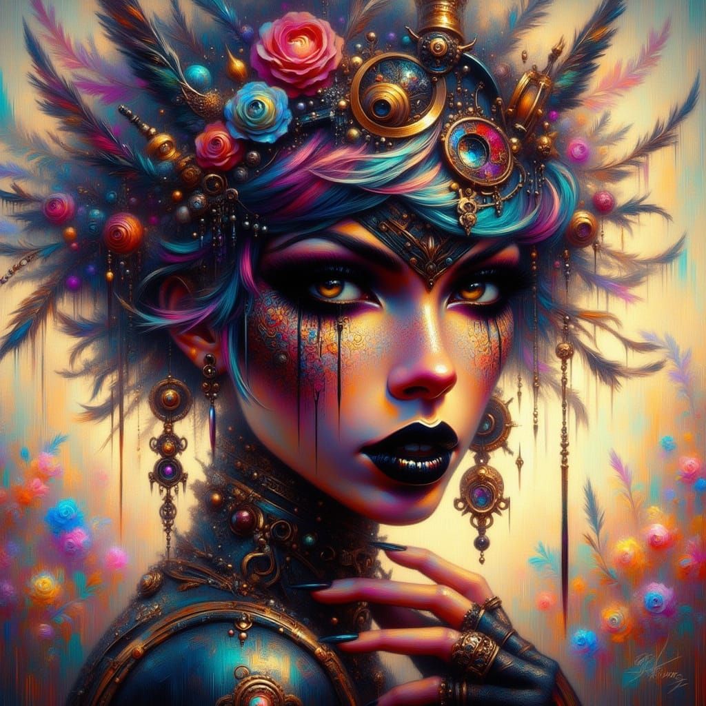 A vibrant portrait of a woman blending futuristic and steampunk aesthetics. Rendered with dynamic lighting and intricate detail, this concept art showcases bold colors and a sophisticated style.
