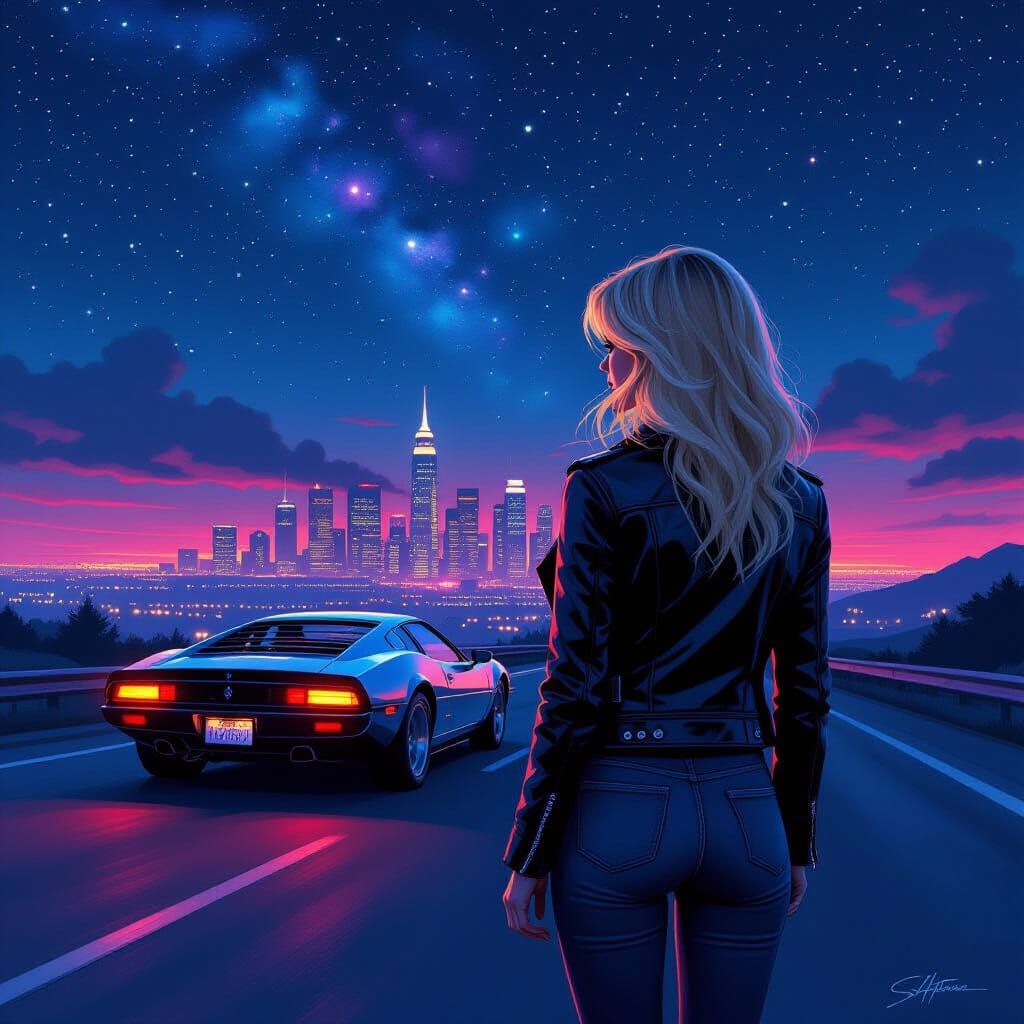 This image shows a woman in a leather jacket, viewed from behind, contemplating a glowing city skyline. The artwork features dark, atmospheric tones and polychromatic hues in a gothic concept style.