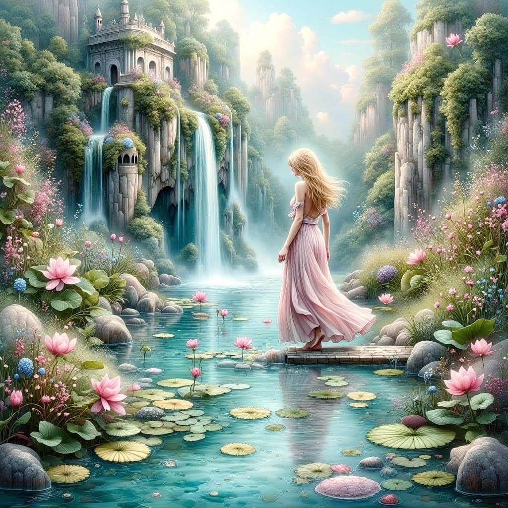 This image shows a close-up of a beautiful woman walking through a serene landscape, surrounded by soft colors and atmospheric light, with a majestic waterfall and wildflower meadows in the background, in a realistic and hyper-detailed pastel style.