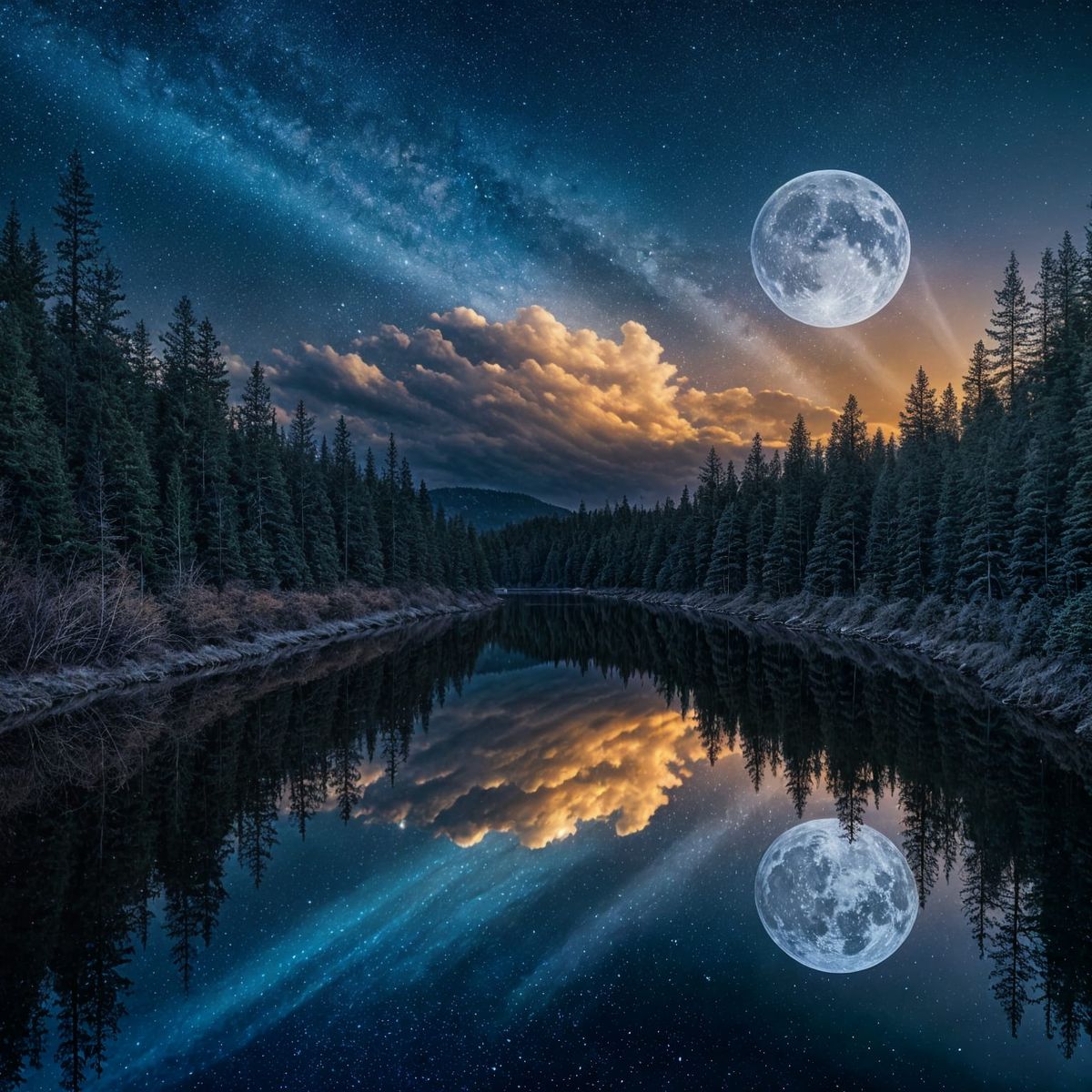 A striking picture of a detailed night landscape featuring a star-filled sky reflected in a calm river. Towering pines frame the scene, illuminated by moonlight and soft sunset hues, creating a captivating mirrored effect.