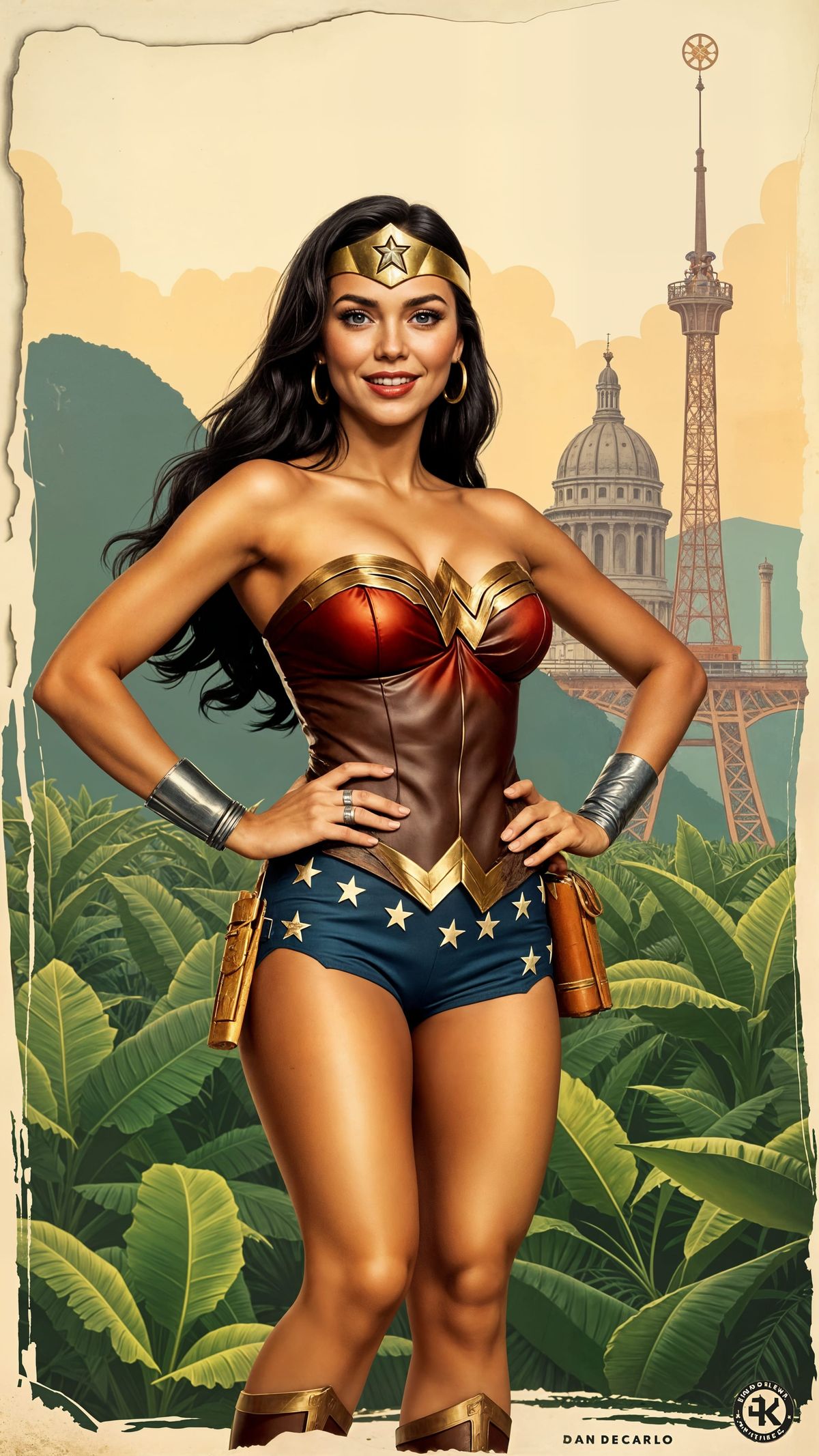 This vibrant travel poster captures Wonder Woman's joyful getaway in the Democratic Republic of the Congo, surrounded by iconic Kinshasa landmarks and nostalgic charm, evoking classic Hollywood glamour and retro flair.