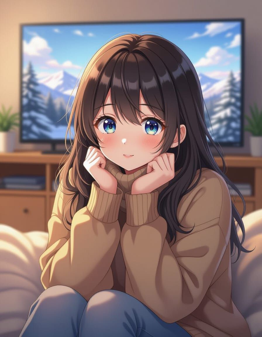 This image shows a realistic anime girl in casual clothes, relaxing in her room while watching Netflix on a large TV. The artwork features intricate facial details and a warm, inviting atmosphere.