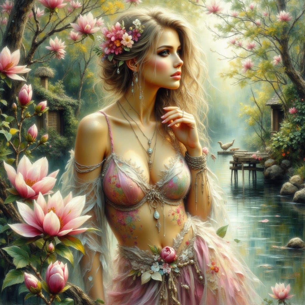 A full body image of an exotic woman standing by a shaded pond, with magnolias and lush forests near a stone cottage. The scene is bathed in soft morning light with a delicate color palette.