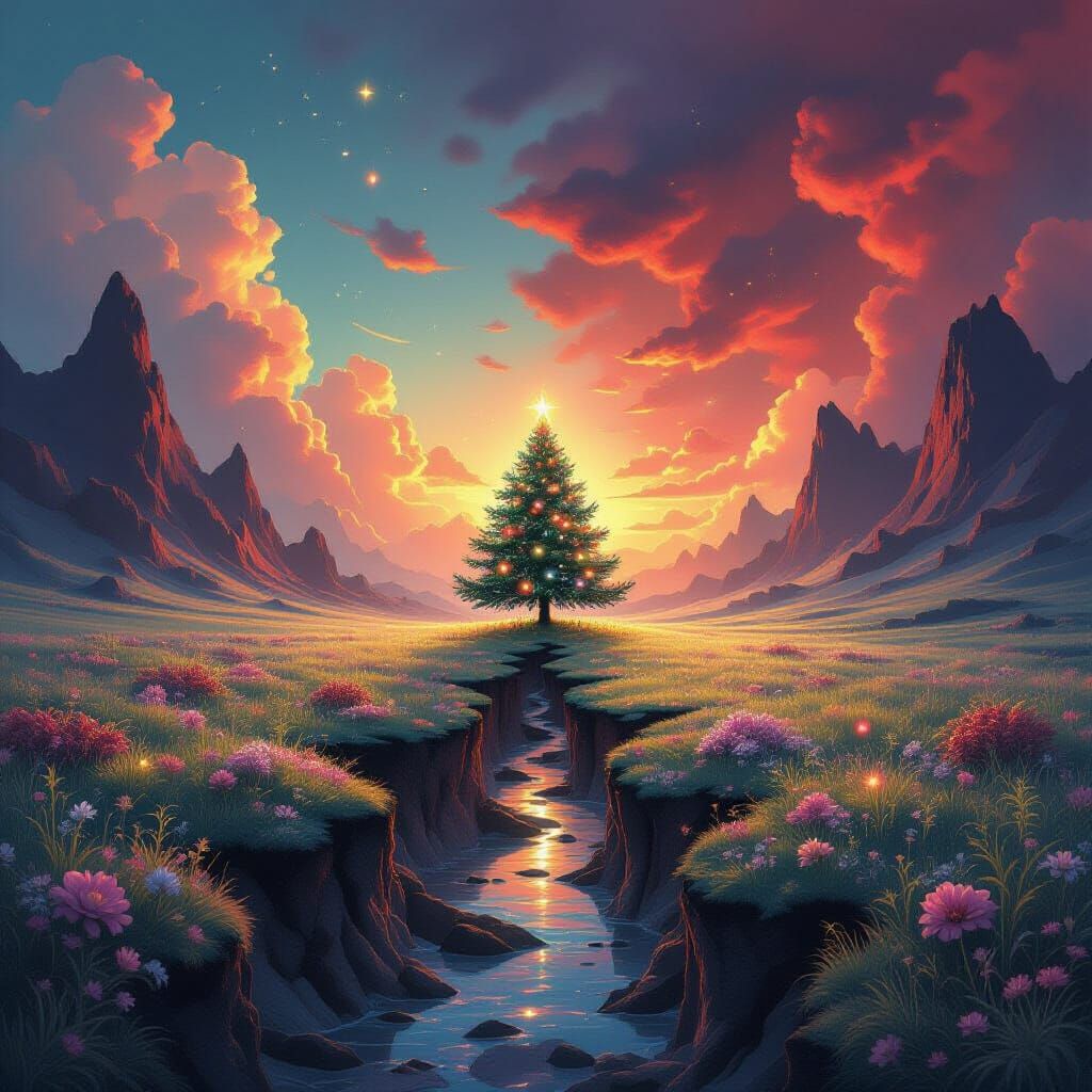 This surreal image shows a Christmas tree at a fracture point between a peaceful meadow with sprites and a volcanic landscape with shadow creatures, rendered in a dreamlike, textured style.