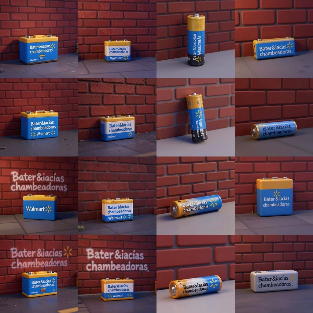 This image shows a realistic 3D render of a Walmart battery on the ground against a brick wall. Subtle urban graffiti adorns the battery, rendered in a popular game engine style with realistic lighting and shadow depth.