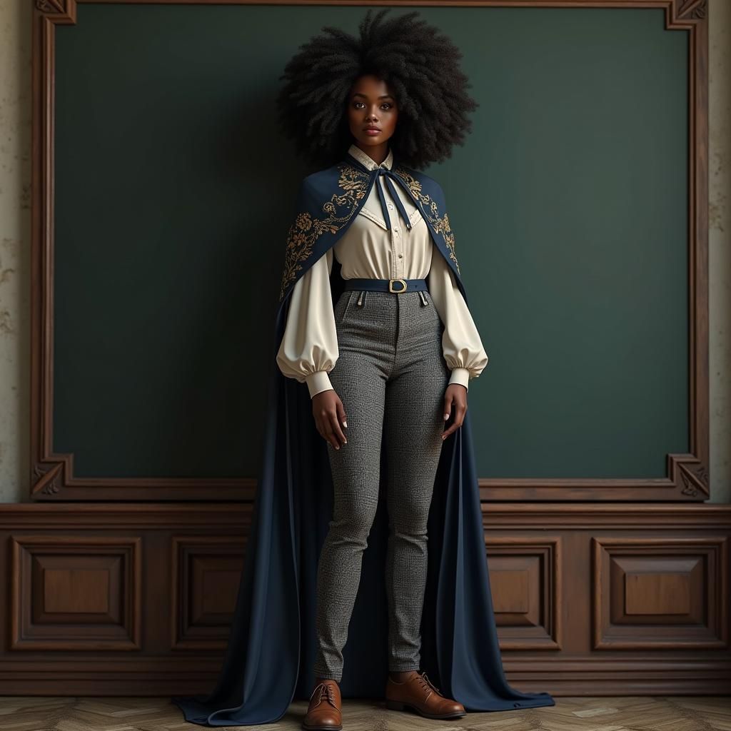 A captivating image shows a young Black woman in wizard attire standing by a chalkboard. The artwork features a fantasy concept art style with muted colors, rich textures, and realistic details.