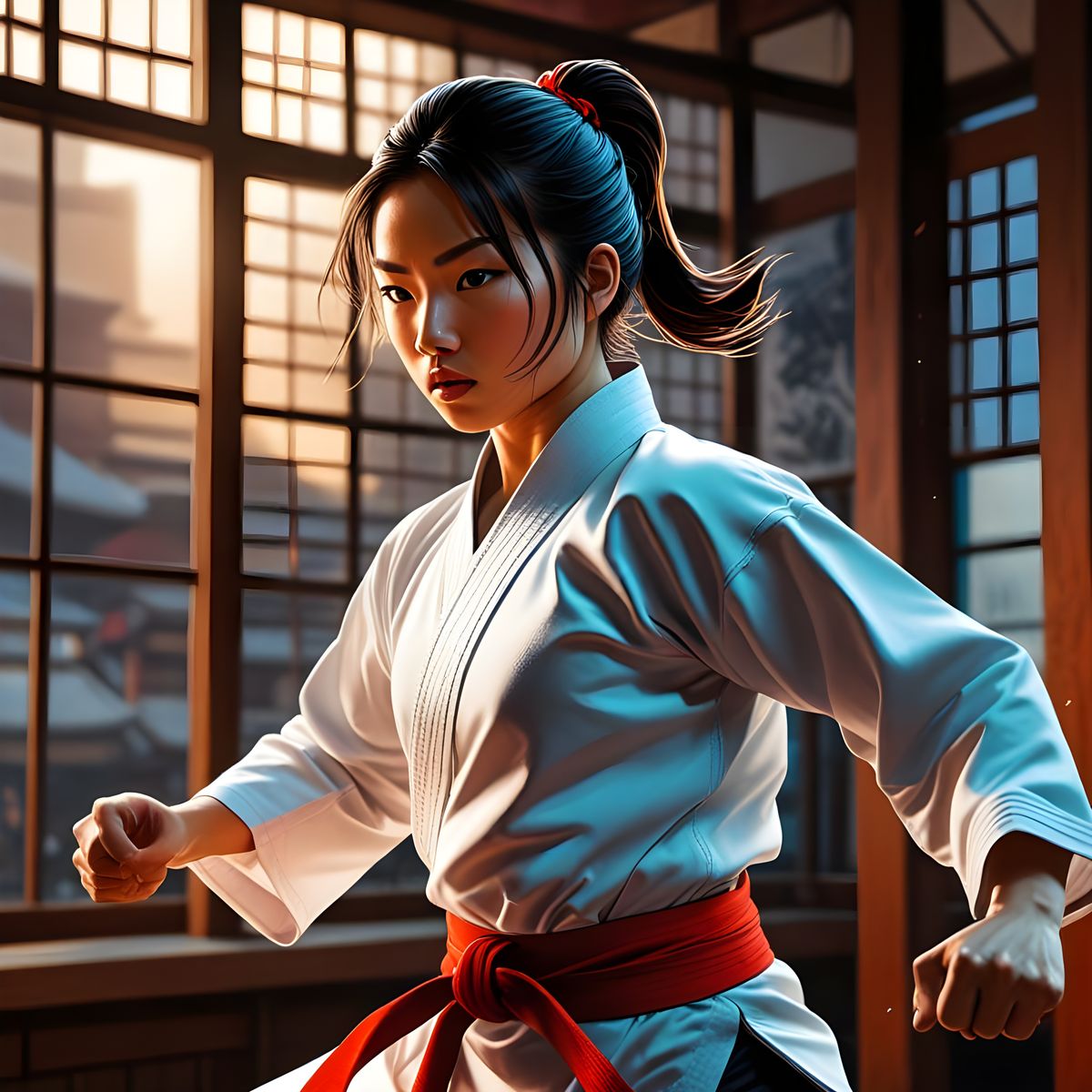 This image shows a young Asian girl practicing karate in a dojo. The artwork is reminiscent of comic book art, with smooth lines and perfect execution.
