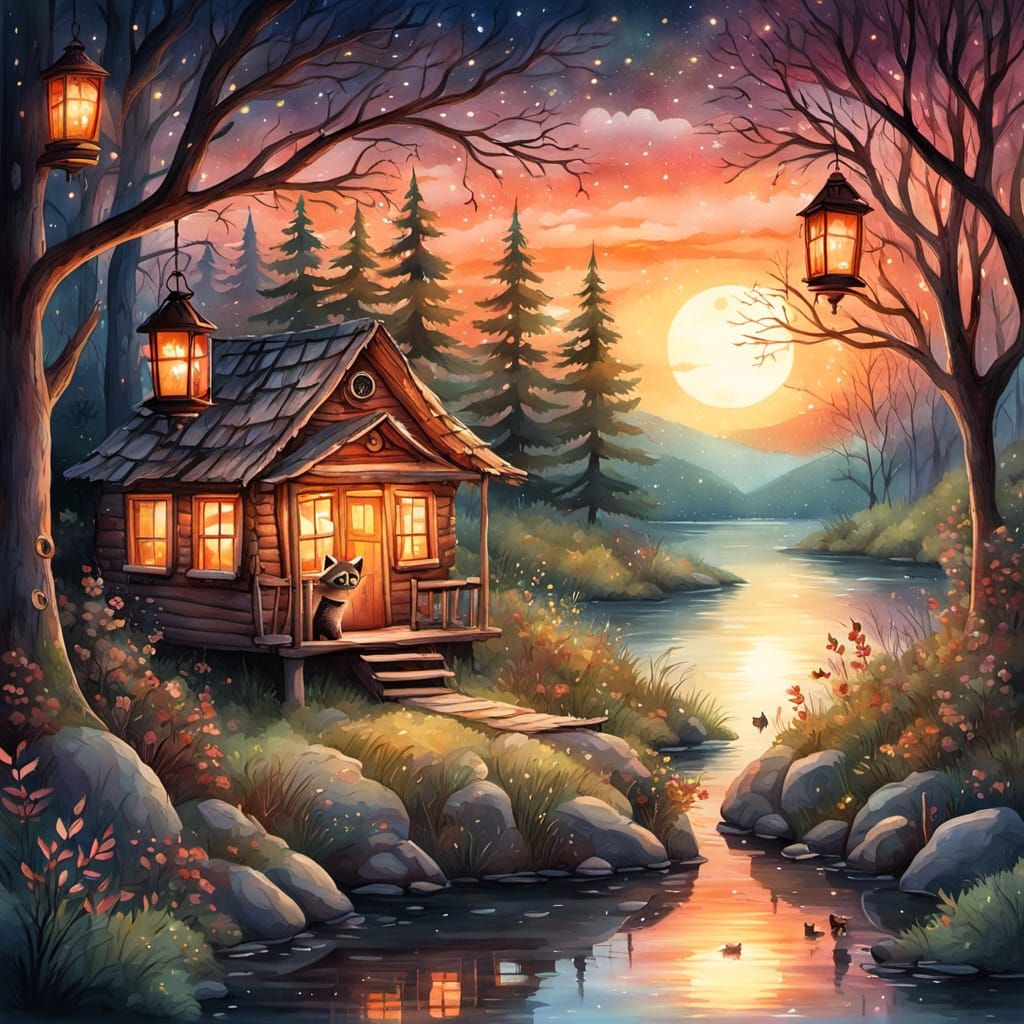 A striking picture of a raccoon's whimsical cabin nestled among the trees near a river. Soft light glows from within as warm sunset colors fill this serene watercolor scene.
