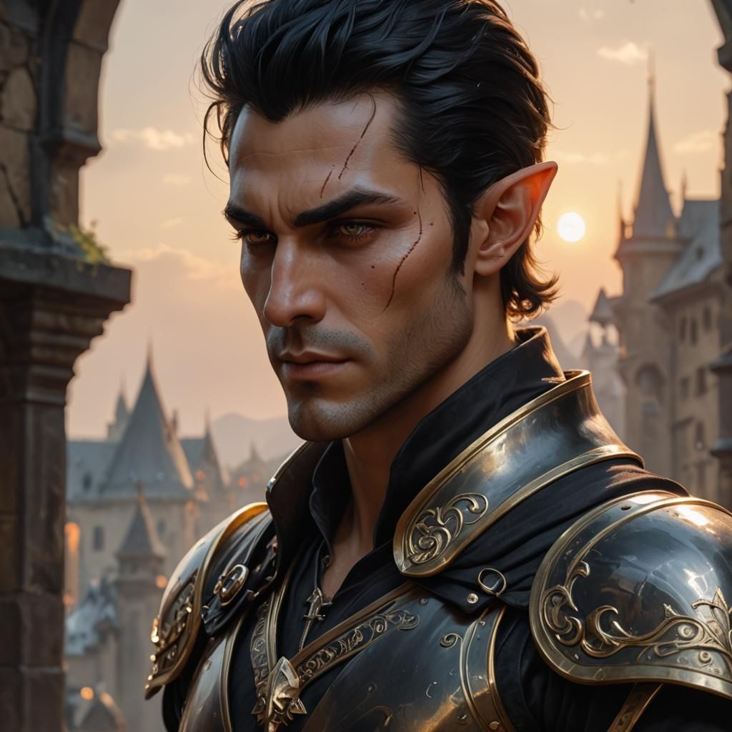 High fantasy epic attractive male Elf undead fighter, death, pointed ears, slick black hair, dull skin, scar, black armor, dark scenic horror background, high detail, high quality, correct anatomy, 8k resolution concept art portrait, Artgerm, WLOP, Alphonse Mucha dynamic lighting hyperdetailed intricately ...