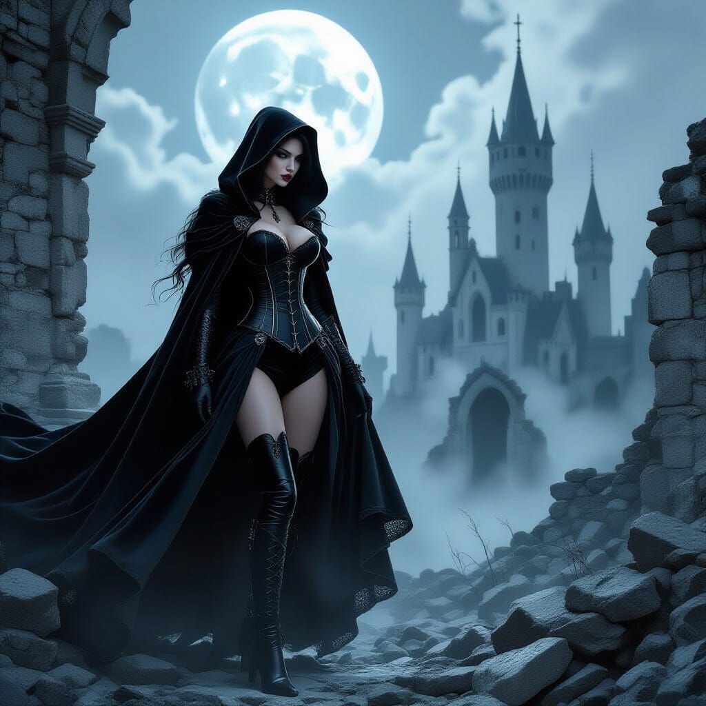 This image shows a female vampire in gothic attire standing in castle ruins. The image blends whimsical, biomechanical, and futuristic noir styles, featuring intricate textures and dramatic shadows.