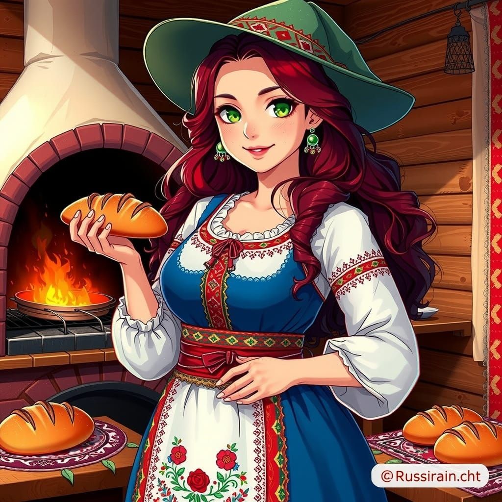 A vibrant anime heroine in traditional Russian attire, surrounded by warm sunlight, holds a steaming loaf of bread, exuding joy and charm