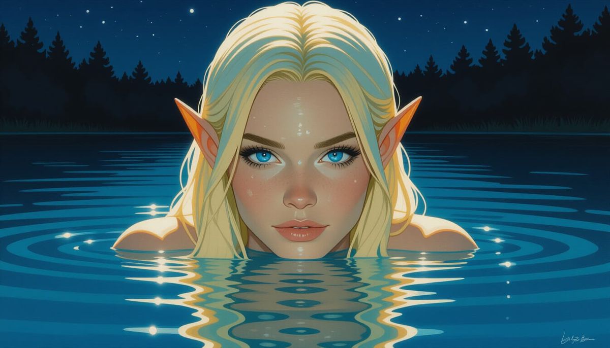 This image shows an elf woman swimming in a dark lake at night. Moonlight reflects on the water in this photorealistic image, emphasizing textures and lifelike details.