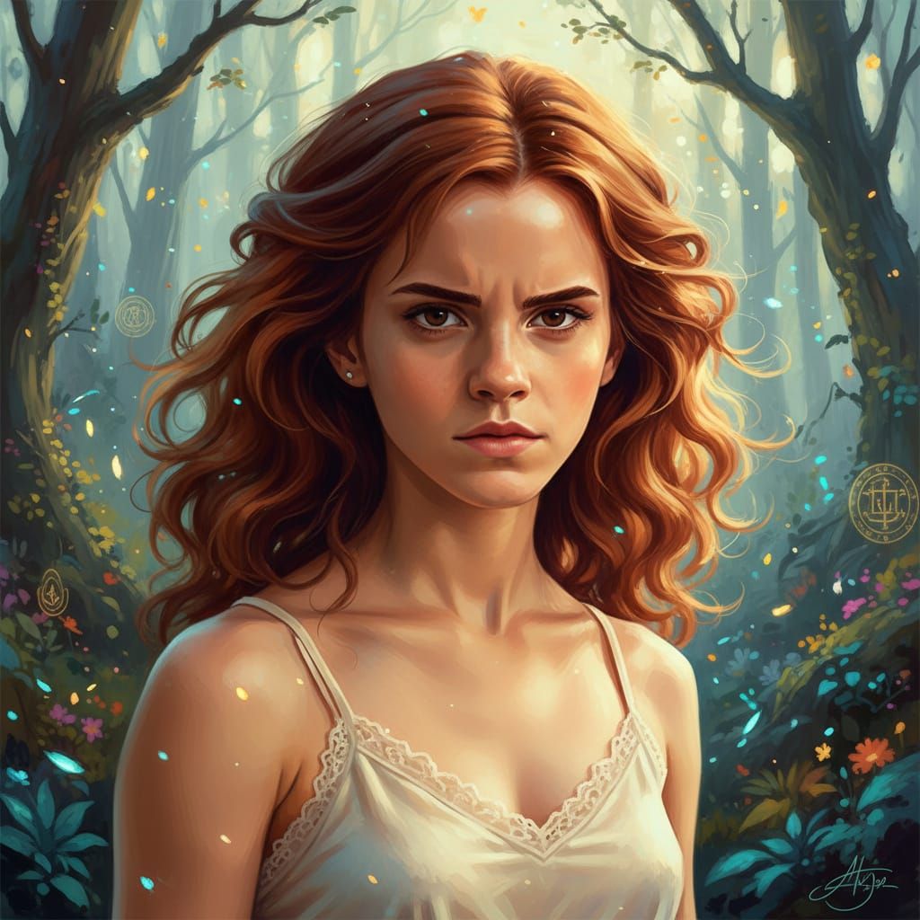 A close-up fantasy portrait of a teenage Hermione Granger in a camisole, rendered with detailed realism and painterly qualities. Ethereal lighting highlights her determined expression and auburn hair against a blurred enchanted forest.