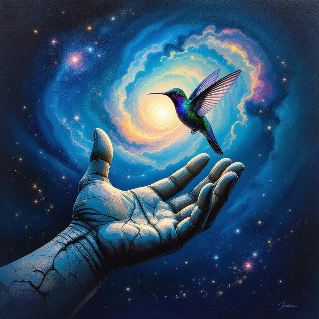 A striking picture of an ancient stone hand emerging from a swirling nebula. It cradles a vibrant hummingbird against a backdrop of distant galaxies, rendered with hyperrealistic textures in a whimsical style.